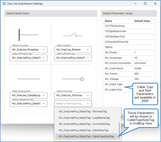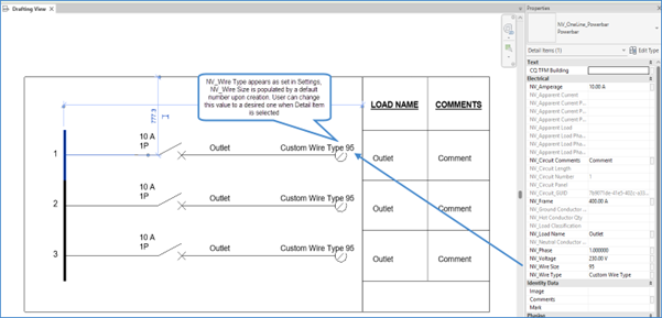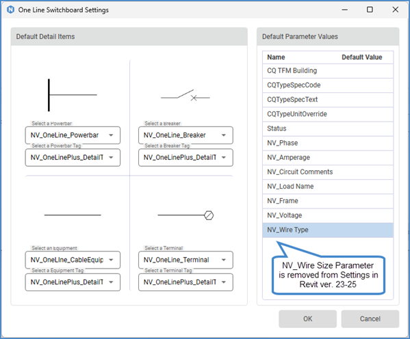 - 1d Note: NV_Wire Size no longer appears as a Default Parameter Value in 2023, 2024 and 2025 versions in One Line Switchboard Settings Menu. However, when the user creates a Drafting View, that parameter is available in Properites Palette of Drafting View’s Detail Items. Upon creation, it will be populated by a default value, and the user can change that value by selecting a Detail Item and changing it in Properties, or by clicking on WireTypeSizeTag.