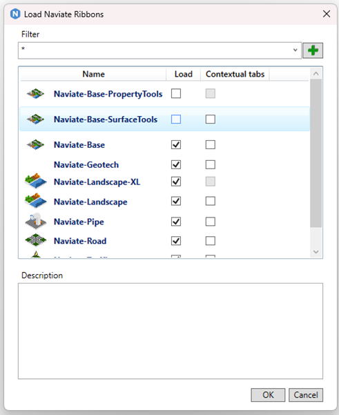 In this version of Naviate we created a new way of accessing your Naviate Ribbons. The Naviate Base ribbon will always be loaded and from the Load Naviate button you can load the ribbons you need. If you create your own CUIx-files, these can also be loaded from this menu. Tick the appropriate column to use Context or Non-Context-ribbons.