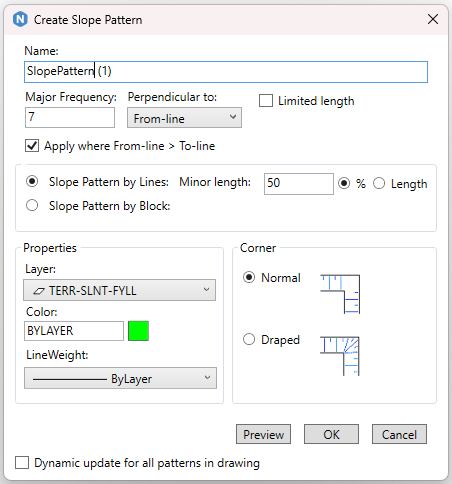 - ‘Apply where From-line > To-line' can be used to only get slope pattern where the first selected line is at a higher elevation than the the second selected line. E.g. to create a Cut-slope pattern in one color and a Fill-slope pattern in another color. When using this option, after a cut-pattern is created, the command automatically asks if the fill-pattern should also be created.