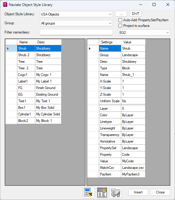A new command that creates Blocks, Text and Cogo Points with pre-specified settings. The command reads a list of objects stored as CSV in Naviate Support Folder NVObjectStyles.