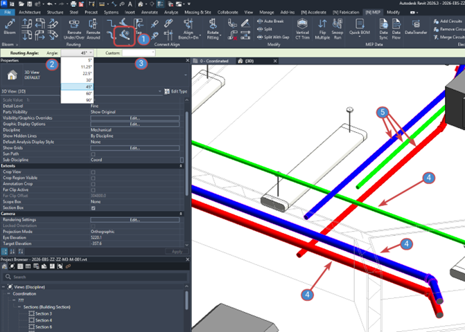 This is a new command in [N] MEP that further advances the existing “Roll Into Main” command. Compatible with the ‘Pipe’ MEP System Family, Auto Routing will roll the branch Pipe into a main with a user-specified, custom angle elbow - then complete the connection with a tee.