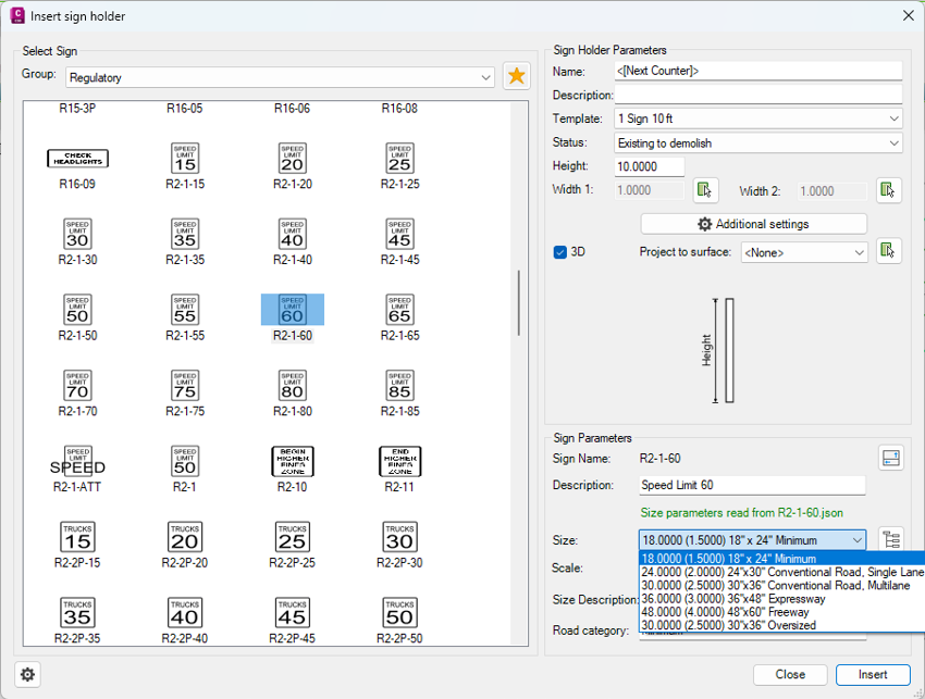 each sign now has an individual size dropdown. The size includes a Road Category which when selected is then remember for the next sign. Sign Sizes can be displayed in either inch/mm or feet/meter.